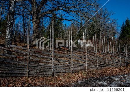 Wooden fence, assembled from flexible branches in sunset