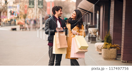 Loving couple waiting for taxi after shopping in city center, walking with bags outdoors, free space