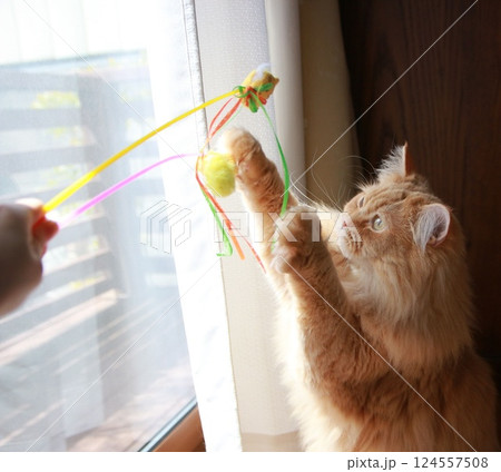 窓辺で猫じゃらしで遊ぶラガマフィンの成猫のバストアップ