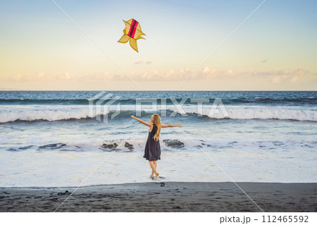 A young woman launches a kite on the beach. Dream, aspirations, future plans