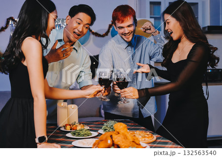 Diversity, dinner and group of people toast celebration together at party. Friends, happy and celebrate with food, wine and friendship for love, support and cheers champagne at business function
