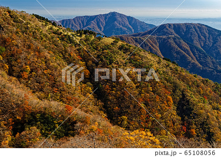 丹沢・塔ノ岳から見る紅葉の山並みと関東平野・筑波山