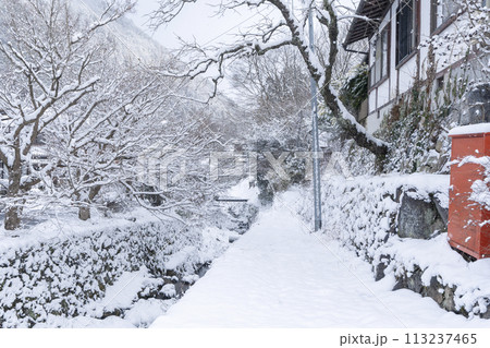 冬の京都 大原 雪景色の三千院参道 茅穂橋(未明橋)