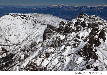冬の八ヶ岳連峰・硫黄岳から見る横岳の岩峰と赤岳