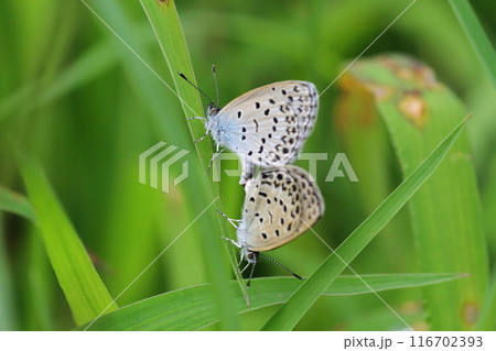 稲の葉の上交尾中のヤマトシジミ