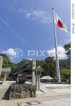 〈島根県)出雲大社 神楽殿の大注連縄と国旗