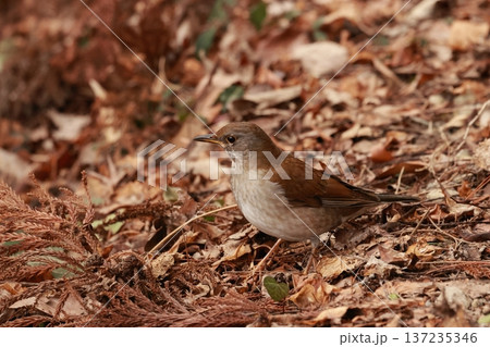 落ち葉の下のエサを探すシロハラ