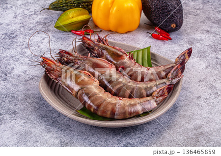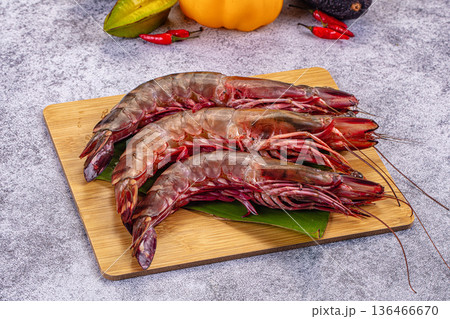 Fresh raw giant red prawns on a plate with chili peppers and tropical vegetables.