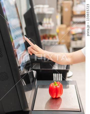 A woman buys bell peppers at a self-checkout.