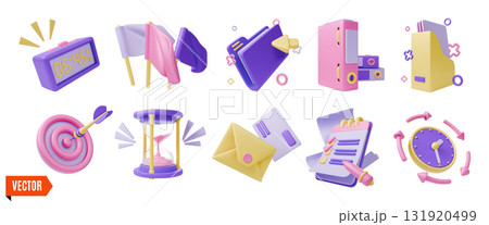 3d Productivity Concept Icon Set Cartoon Design Style Include of Digital Alarm Clock, File Holder Binder Folder with Documents, Target Goal and Hourglass . Vector illustration