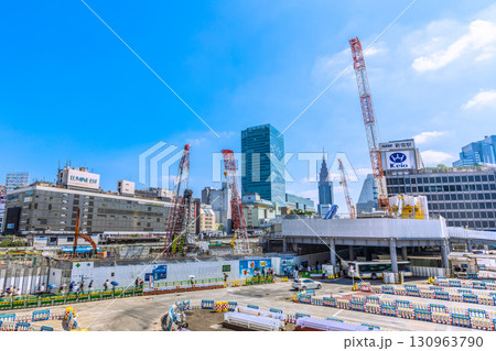 日本の東京都市景観 渋谷ハチ公前広場前から渋谷駅再開発や大型クレーンなどを望む=8月20日