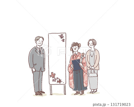 卒業式、成人式、お祝い、式典で記念撮影する親子(大学生)、線画、