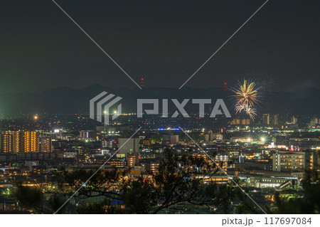 日本の岡山県岡山市の山から見た美しい打ち上げ花火