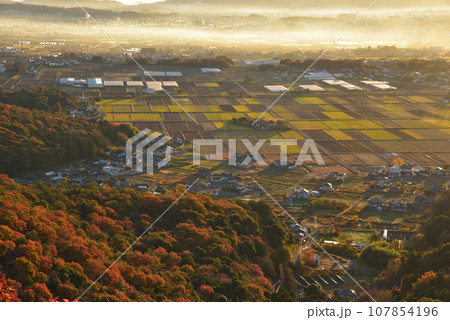 晩秋の大小山山頂南側小ピークから朝日の差し込む色付く大小山山麓と田園地帯を見る