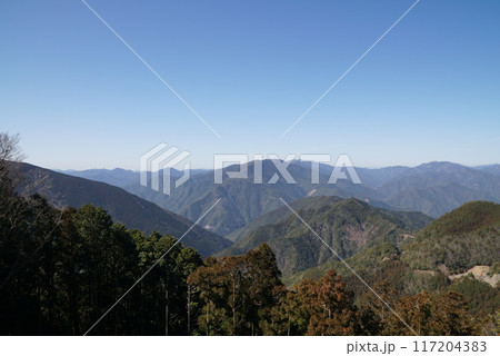 立里荒神社の参道のから見た大峯山系の山々と新緑2 奈良県吉野郡野迫川村