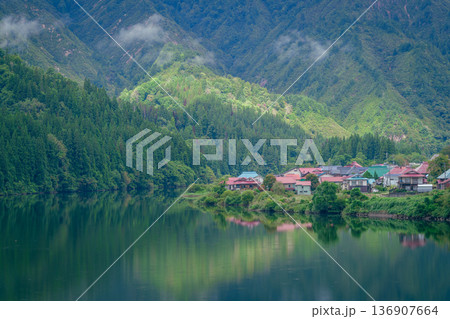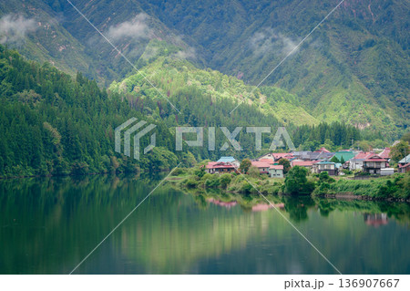 只見川に映る集落・大志地区(福島県・三島町)