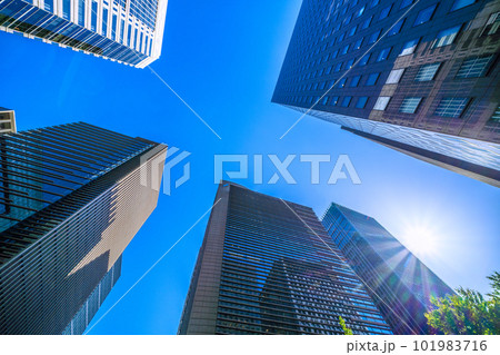 日本の東京都市景観 夏のような日差し。大手町の交差点から、青空に映えるオフィスビル群や太陽などを望む