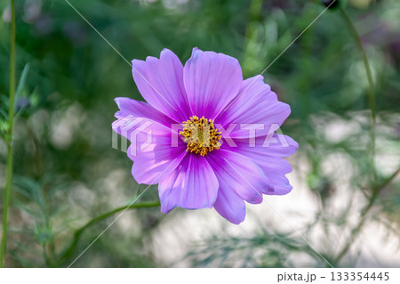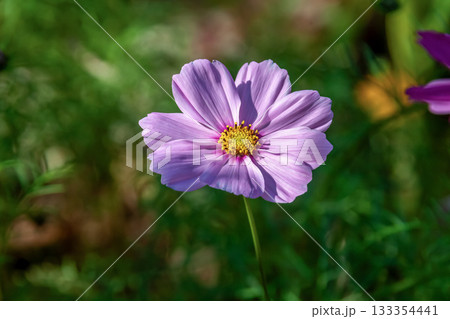 朝の柔らかな光を背に健やかに咲く桃色コスモス
