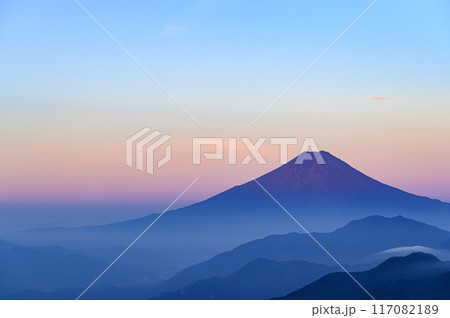 山梨県・早朝の雁ヶ腹摺山から見る富士山と山並み