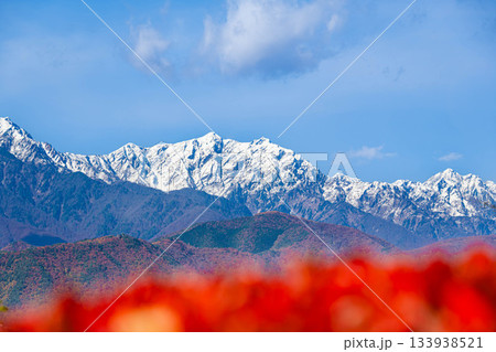 大町市から見た冠雪後三段紅葉の白馬の山々