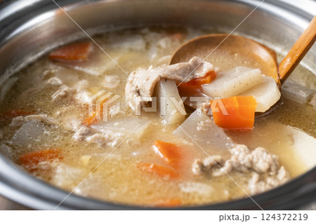 豚汁を掬う