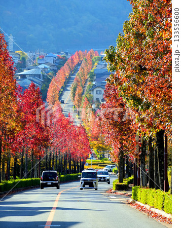 京都・桂坂の紅葉したモミジバフウの並木道の夕暮れの風景