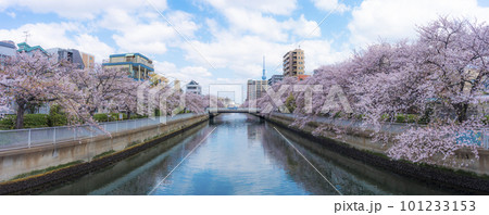 東京都墨田区大横川と桜のパノラマ風景