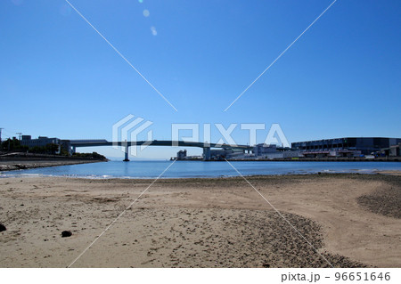 芦屋市 東灘芦屋大橋(県道722号線と阪神高速5号湾岸線が走る)を芦屋川河口の出口付近より遠くに望む