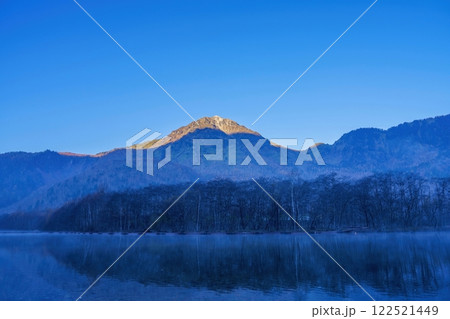 朝日を浴びてオレンジ色に染まる晩秋の穂高連峰の情景
