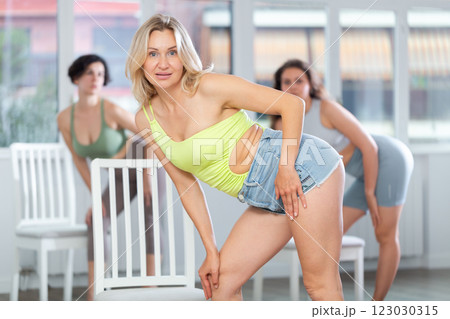 Girl in shorts and tank top stands next to chair, leans on back and performs set of lap dance