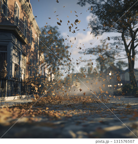 Gust of wind blows dry autumn leaves across quiet street with old houses and trees, creating dynamic and nostalgic fall scene with warm sunlight