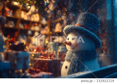 A realistic snowman peers through a glowing shop window, captivated by colorful decorations and gifts inside. Snow gently falls outside, creating a cozy winter scene.