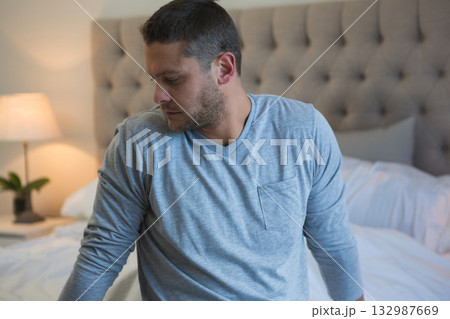 Mid adult man sitting on edge of bed in bedroom by headboard gazing down at plant