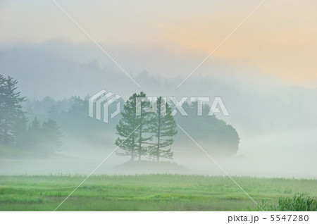 霧に包まれる尾瀬 大江湿原と三本カラマツ