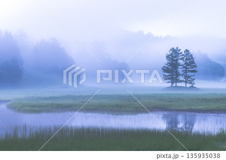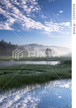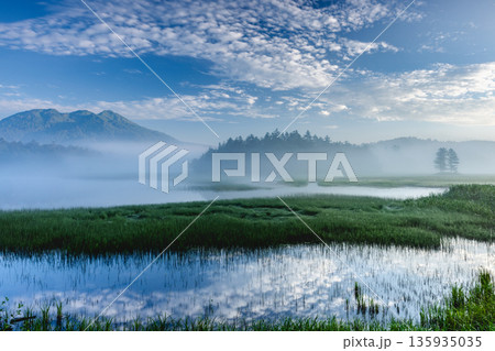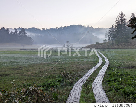 朝霧に包まれた夏の静かな尾瀬沼の大江湿原