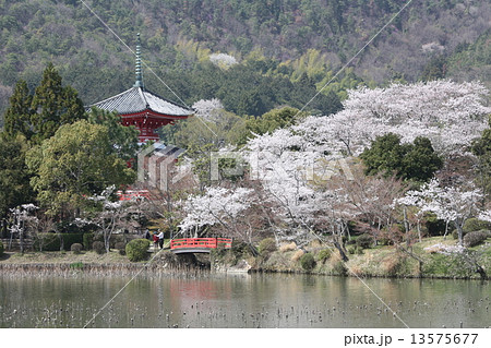 大沢池 水面に映る桜と赤い橋、多宝塔