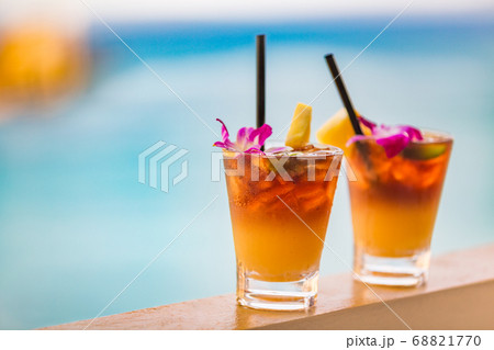 Hawaii mai tai drinks on waikiki beach swimming pool bar travel vacation in Honolulu, Hawaii. Alcohol cocktails with ocean view, luau party nightlife at club.