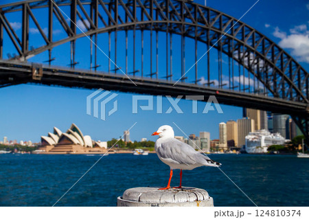 オーストラリア ニューサウスウェールズ州シドニー ギンカモメとハーバーブリッジと世界遺産オペラハウス