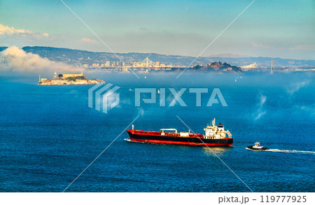 Cargo Ship Passing Through San Francisco Bay with Alcatraz Island in the Background, California, United States