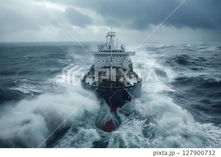 Large cargo ship is sailing through a heavy storm on a dark cloudy day, with big waves crashing around it