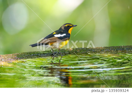 水浴びするキビタキ。山梨県富士吉田市大洞の水場-2025 山中湖の別荘地内にある水場。 崖から美しい
