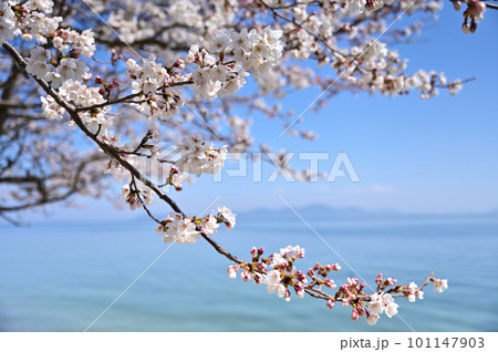 青空を背景にした満開の桜と琵琶湖の風景 Ver1