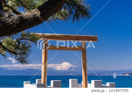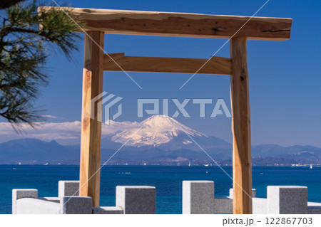 《神奈川県》鳥居の中の富士山・森戸海岸の眺望