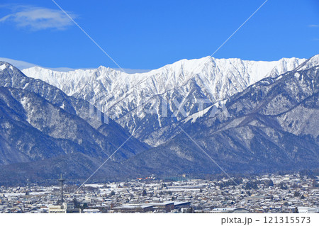 鷹狩山から望む冬の北アルプスと大町市の町並み