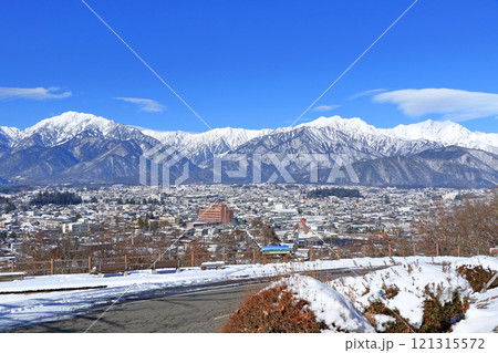 鷹狩山から望む冬の北アルプスと大町市の町並み