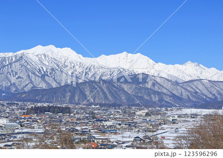 鷹狩山から望む冬の北アルプスと大町市の町並み