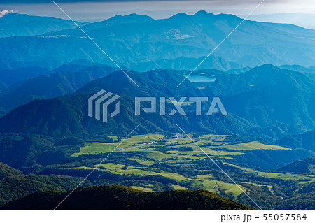 栃木県日光市 霧降高原の登山道から見る丸山と遠方に大笹牧場を望む
