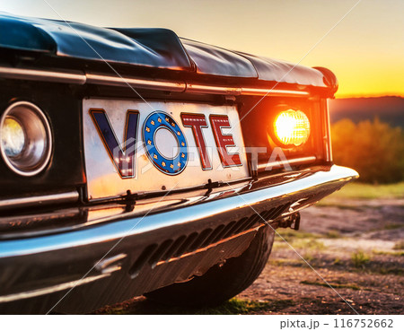 古い車に「投票」と書かれたプレート。アメリカ大統領選挙の投票イメージ。