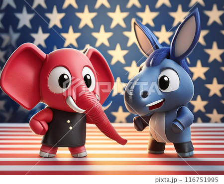 可愛いの青いロバと赤い象は、米国の民主党と共和党を表現。米国の政治、選挙のコンセプトのシンボル