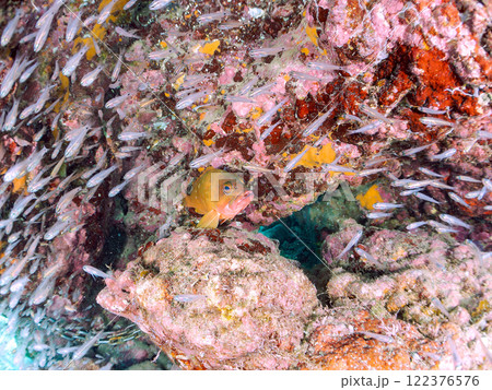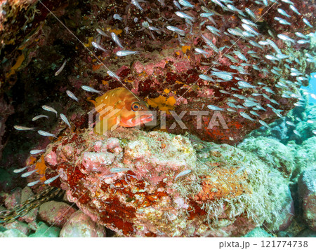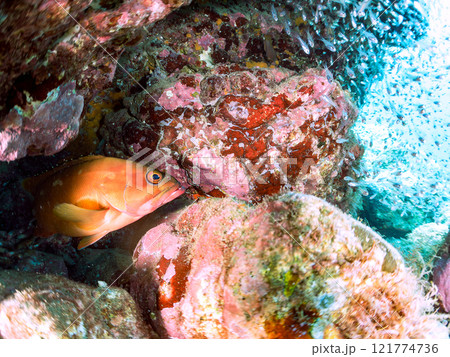 美しいネンブツダイ、クロホシイシモチの幼魚の大群とそれを食糧としつつも守る大きなアカハタ。2024